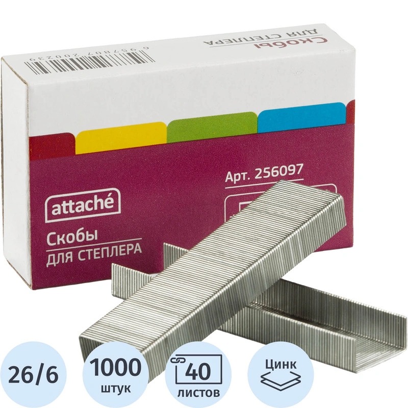 Скобы для степлера № 26/6 Attache предназначены для степлеров со сшивающей способностью от 2 до 40 листов. Скобы № 26/6 выполнены из металла с цинковым покрытием. 1000 скоб в картонной пачке. В промежуточной упаковке — 10 пачек по 1000 скоб.