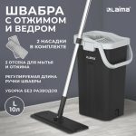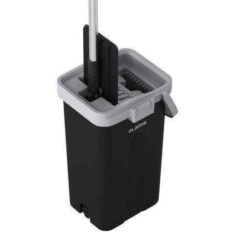 Ведро объемом 10 литров, при этом полезный объем ведра 7 литров. Разделено на два отсека для чистой и грязной воды: один отсек для мытья – позволяет вымыть швабру, не дотрагиваясь до нее руками, второй – для вертикального отжима швабры за несколько секунд. Оба отсека в нижней части ведра имеют сливные отверстия с резиновыми заглушками, которые надежно защищают ведро от проливания жидкости во время использования.