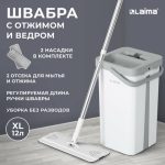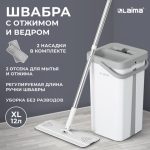 Ведро объемом 12 литров, при этом полезный объем ведра 9 литров. Разделено на два отсека для чистой и грязной воды: один для мытья – позволяет вымыть швабру, не дотрагиваясь до нее руками, второй – для вертикального отжима швабры за несколько секунд. Оба отсека в нижней части ведра имеют сливные отверстия с резиновыми заглушками, которые надежно защищают ведро от проливания жидкости во время использования.