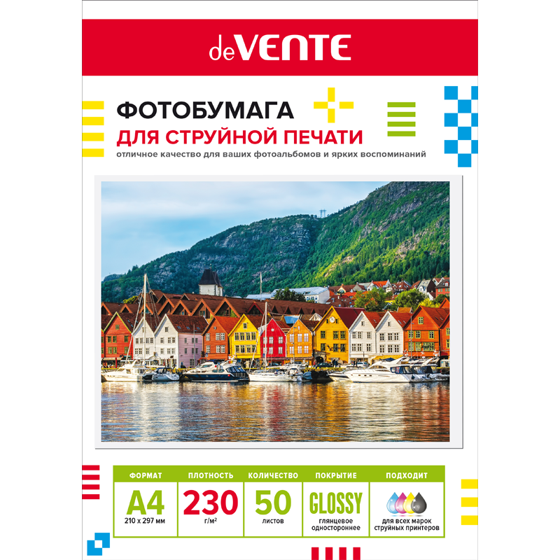 Фотобумага для струйной печати “deVENTE” A4, 50 л, 230 г/м², глянцевая односторонняя, в пластиковом пакете с европодвесом
