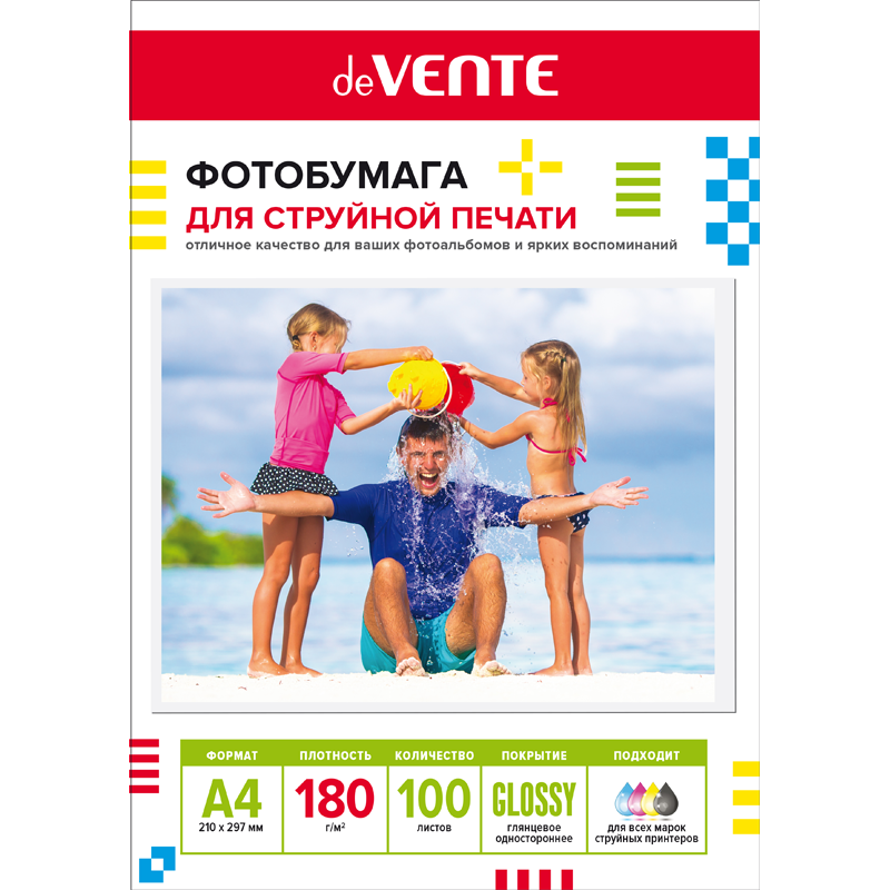 Фотобумага для струйной печати “deVENTE” A4, 100 л, 180 г/м², глянцевая односторонняя, в пластиковом пакете с европодвесом